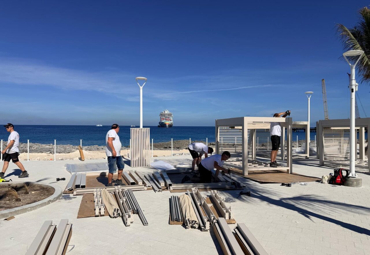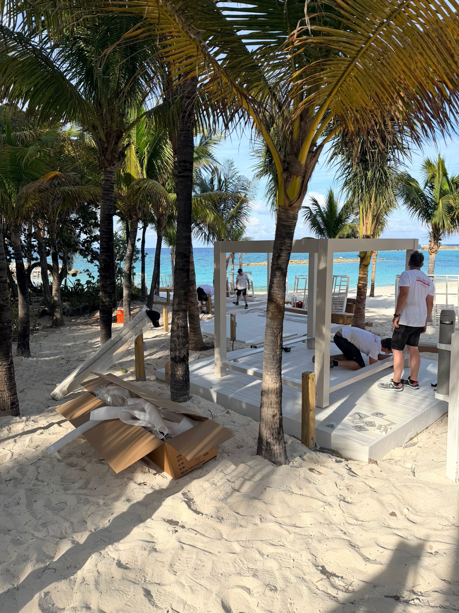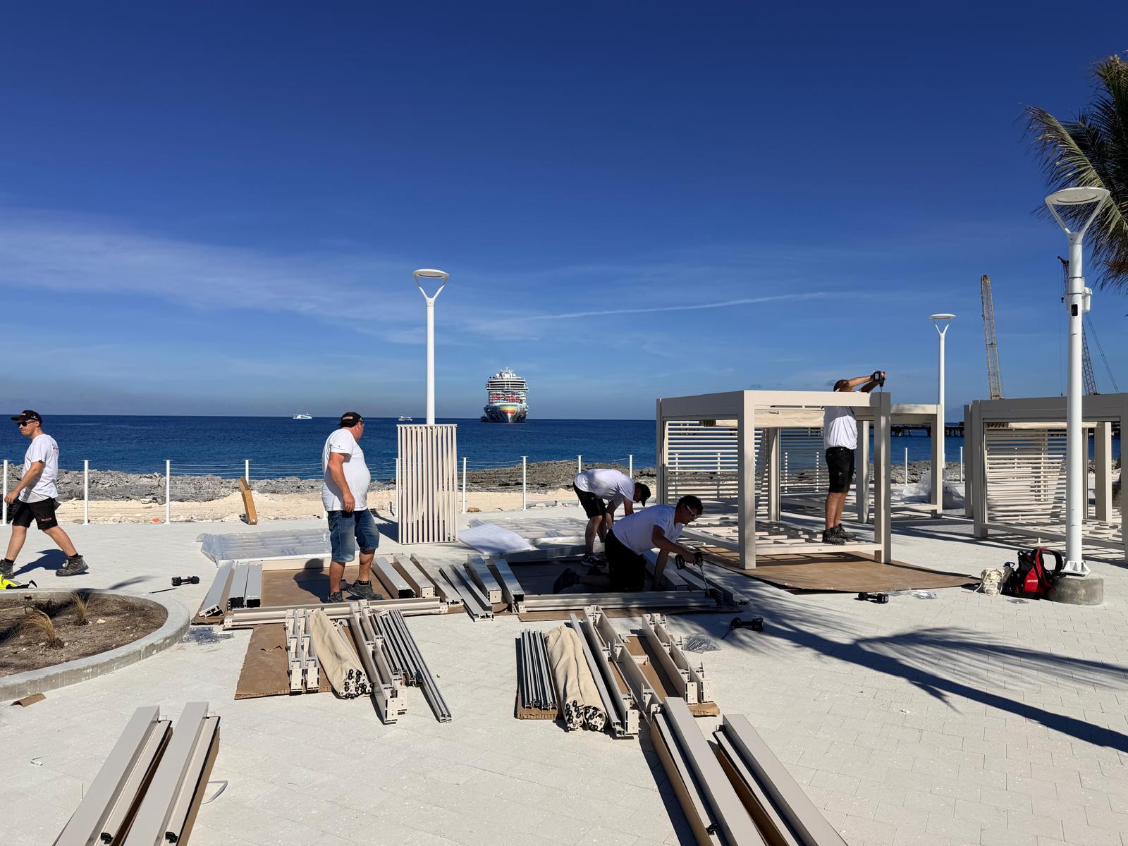 A team from ROBOS, consisting of six crew members, traveled to the USA to build no fewer than 40 cabanas under the blazing sun on Great Stirrup Island. They installed 20 cabanas in the Pool area and another 20 in the Vibe area. The assembly took a total of 10 days.